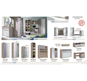 Roma kollektsioon aitab sisustada nii elutoa, kui ka noortetoa. Mööbel on kaasaegse disainiga, korpused jalaka toonis, uksed valged kõrgläikega ja matt hallid. Mööbel on valmistatud mööbliplaadist.